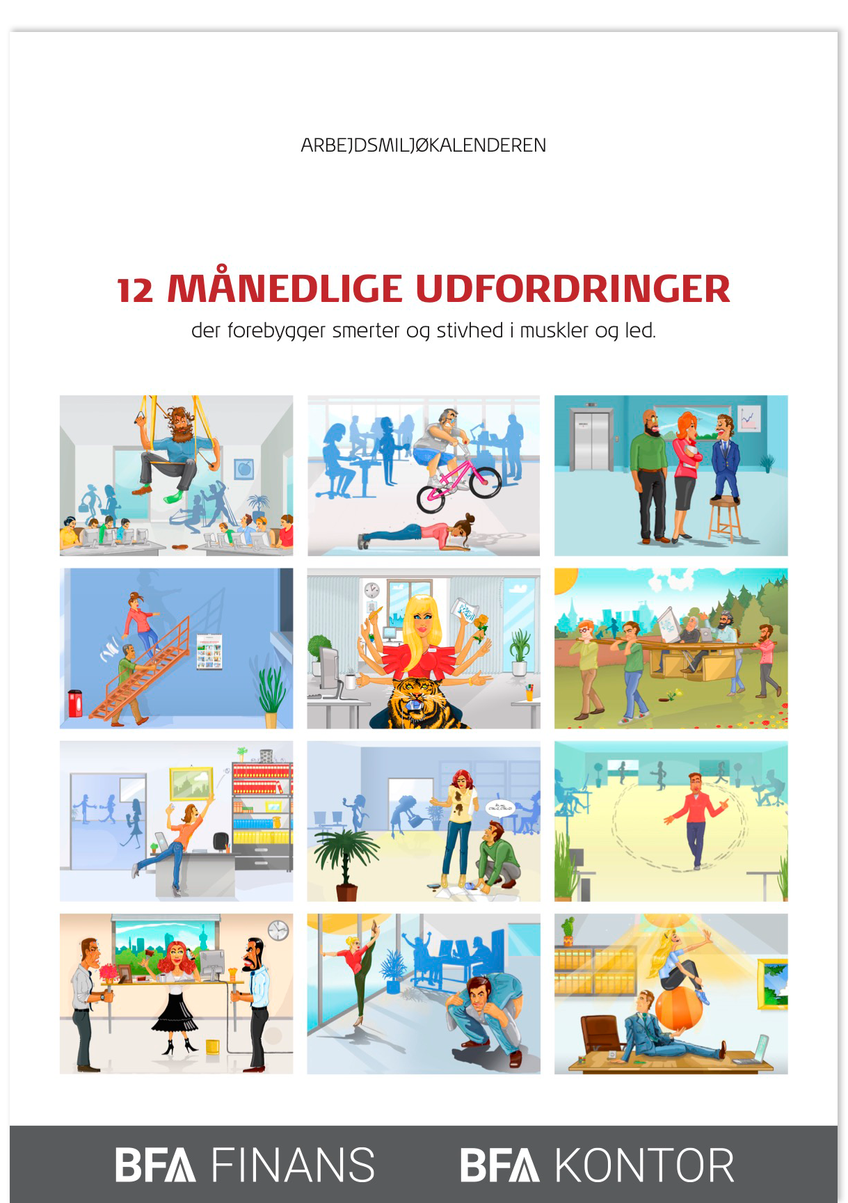 BFA Handel, Finans og Kontor ønskede derfor at udvikle en kalender bygget op omkring 12 månedlige udfordringer med øvelser, der kan udføres på kontoret og sikre, at man får mere bevægelse ind i hverdagen.